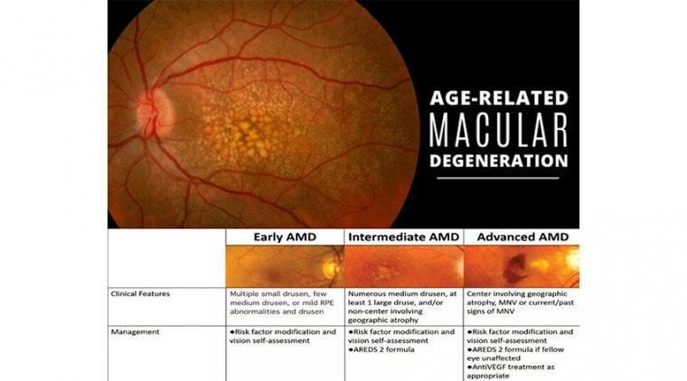 There are three general stages of AMD, partly based on the size and amount of drusen found under the retina on examination.